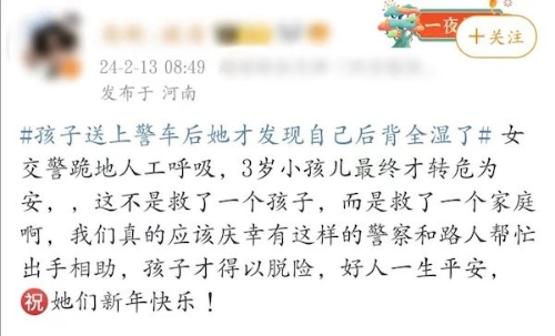 一名女警跪地做人工呼吸,3岁的孩子最终转危为安;今年春节,春城昆明发生了温暖一幕。